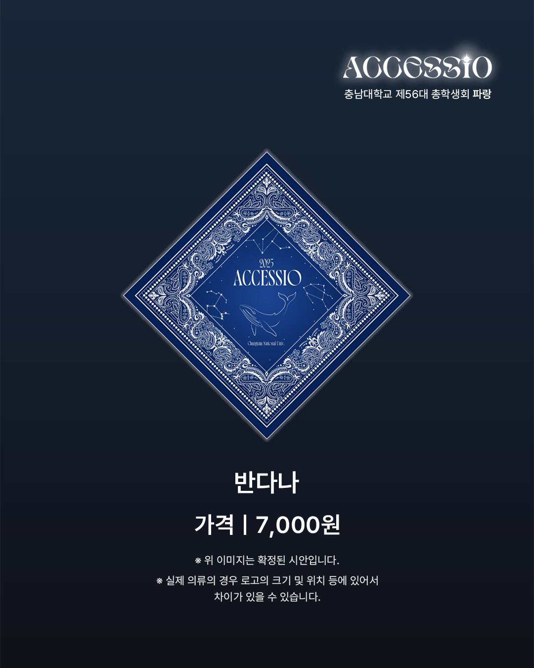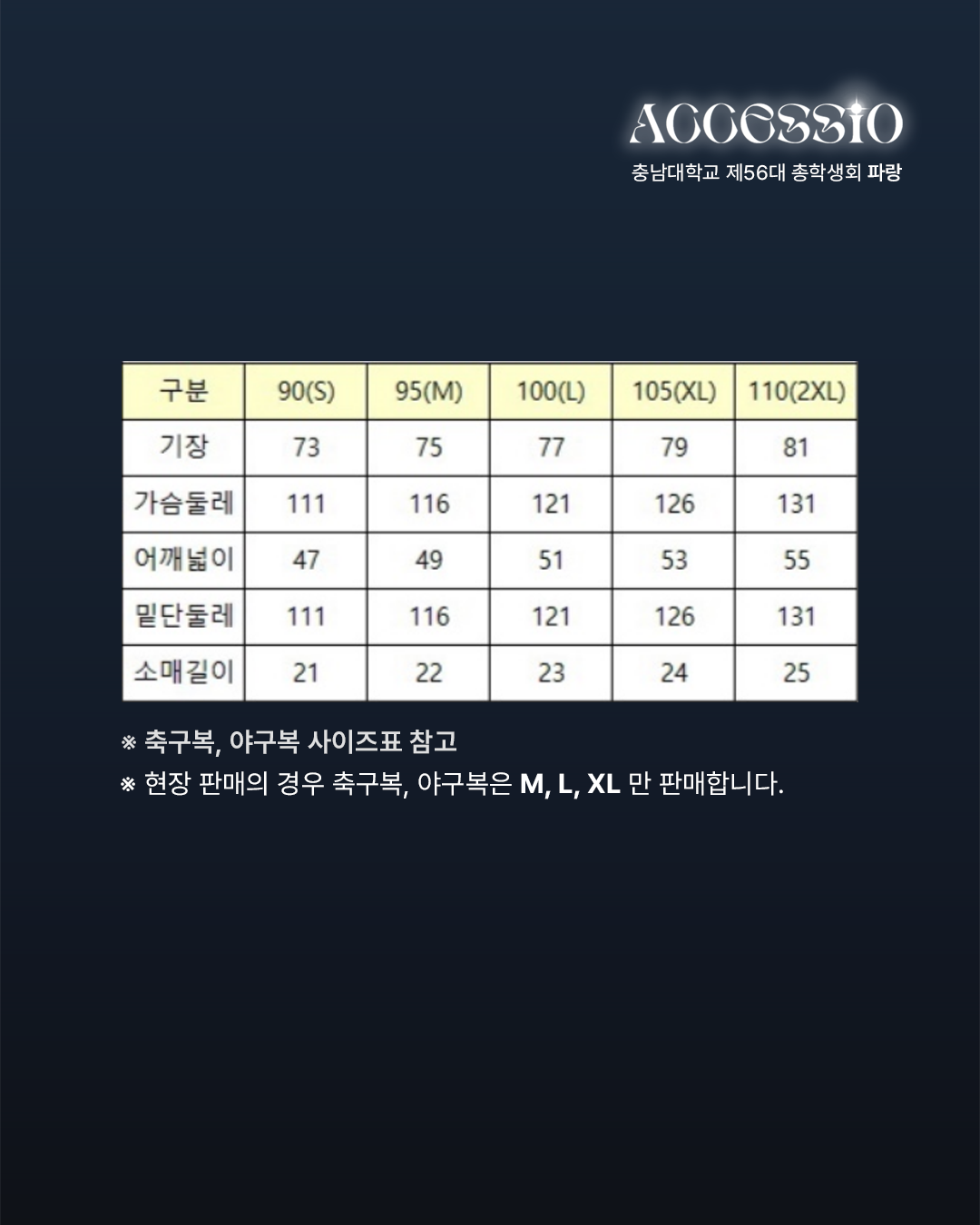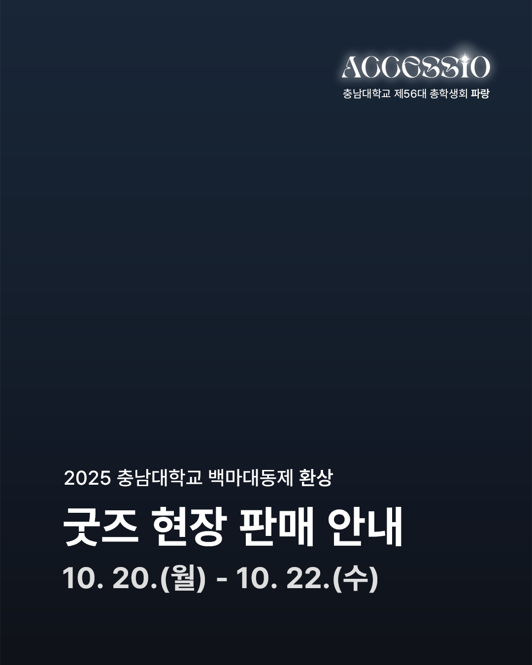 환상으로 물드는 열일곱 번째 물결 학우 여러분, 안녕하십니까. 충남대학교 제56대 파랑 총학생회입니다. 2025년 충남대학교 <ACCESSIO : 환상> 굿즈 현장 판매를 안내드립니다. 학우 여러분들의 많은 관심과 참여 부탁드립니다. 구매 방법 - 축제 기간 중 총학생회 운영 부스에서 구매 구매 기간 - 2025년 10월 20일(월) ~ 2025년 10월 22일(수) * 모든 굿즈는 한정 수량으로, 선착순 구매로 진행됩니다. 굿즈 가격 1) 유니폼(축구, 야구) : 40,000원(M / L / XL) 2) 반다나 : 7,000원 3) 짐색 : 10,000원 * 유니폼의 사이즈는 카드뉴스 내 사이즈표를 참고해주시길 바랍니다. 자세한 내용은 카드뉴스를 참고하여 주시길 바라며, 이외 궁금하신 사항은 DM이나 카카오톡 플러스 친구로 문의 바랍니다. |