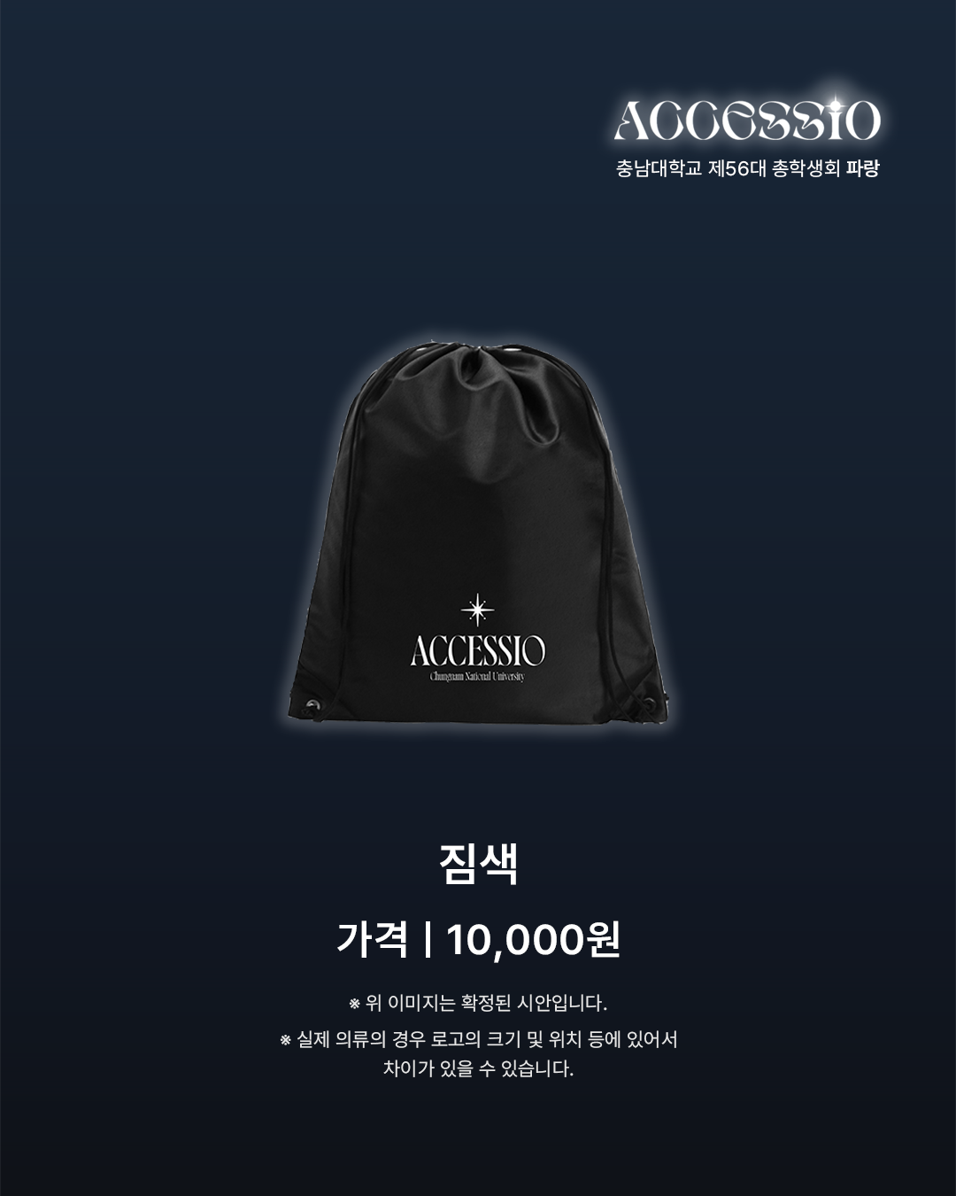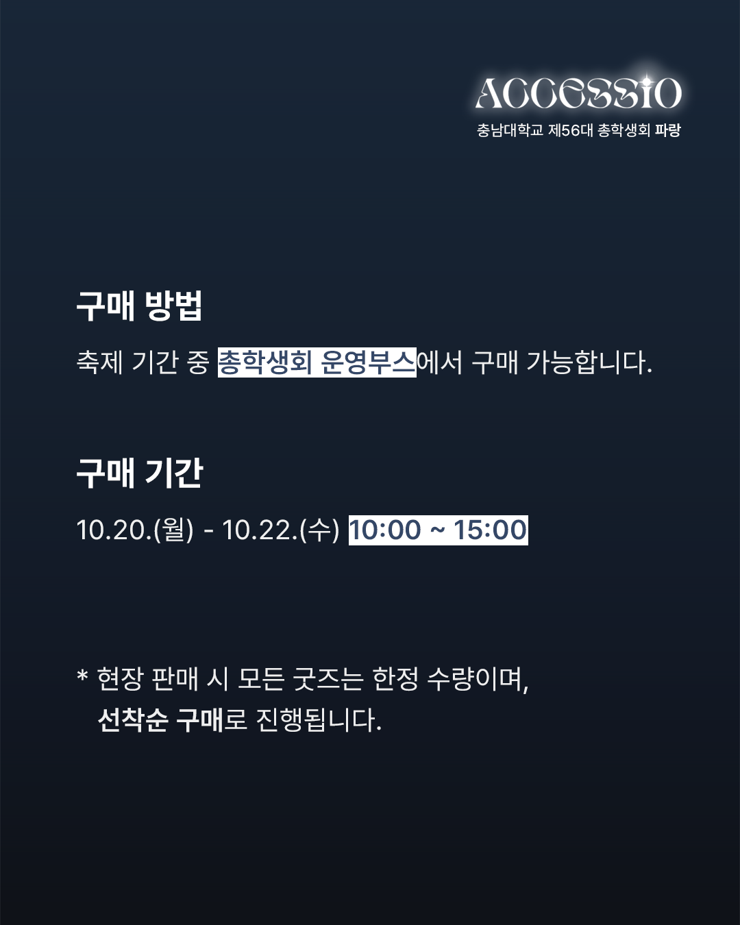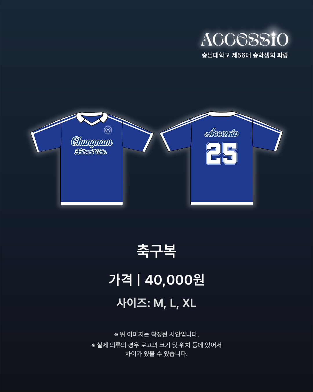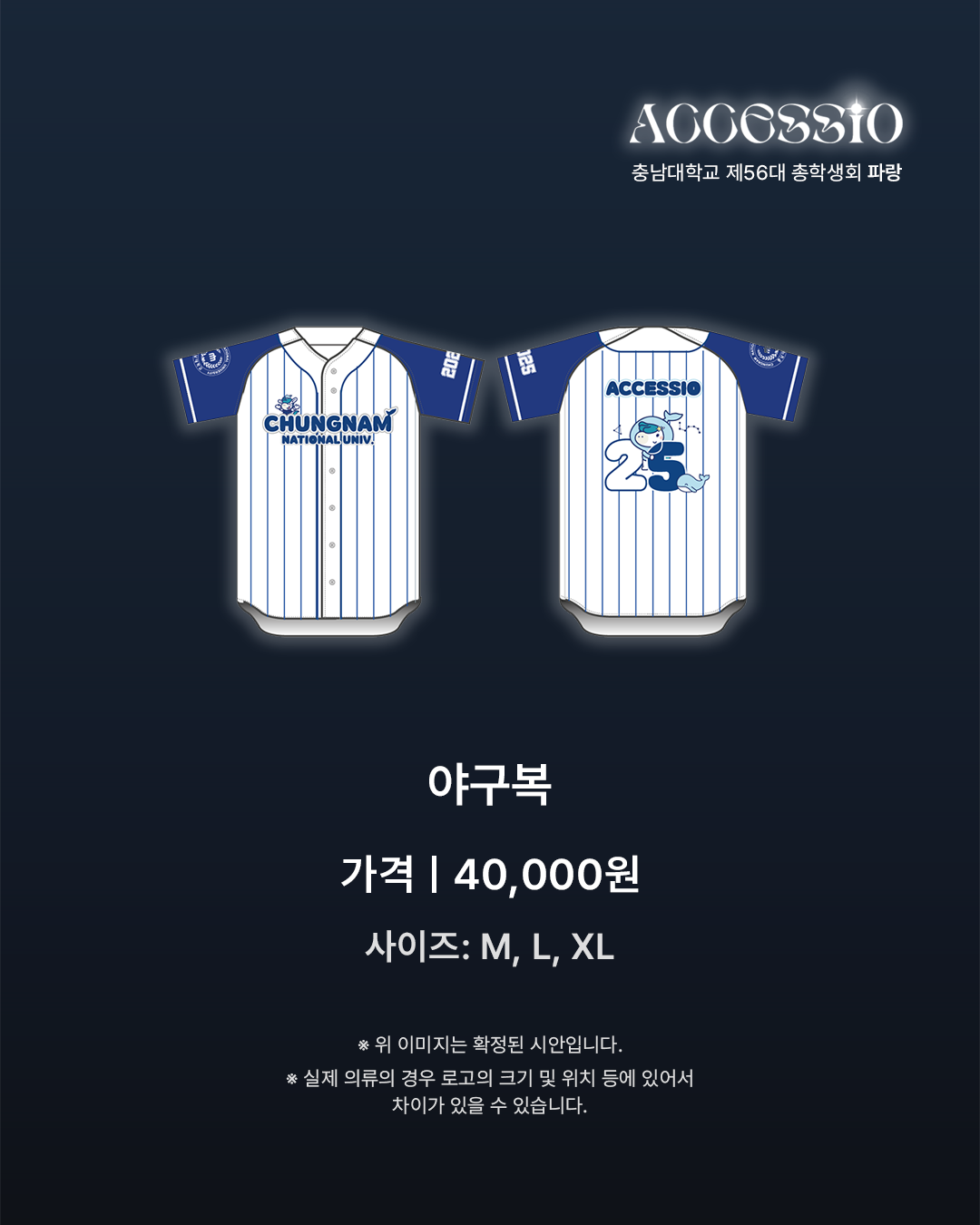환상으로 물드는 열일곱 번째 물결 학우 여러분, 안녕하십니까. 충남대학교 제56대 파랑 총학생회입니다. 2025년 충남대학교 <ACCESSIO : 환상> 굿즈 현장 판매를 안내드립니다. 학우 여러분들의 많은 관심과 참여 부탁드립니다. 구매 방법 - 축제 기간 중 총학생회 운영 부스에서 구매 구매 기간 - 2025년 10월 20일(월) ~ 2025년 10월 22일(수) * 모든 굿즈는 한정 수량으로, 선착순 구매로 진행됩니다. 굿즈 가격 1) 유니폼(축구, 야구) : 40,000원(M / L / XL) 2) 반다나 : 7,000원 3) 짐색 : 10,000원 * 유니폼의 사이즈는 카드뉴스 내 사이즈표를 참고해주시길 바랍니다. 자세한 내용은 카드뉴스를 참고하여 주시길 바라며, 이외 궁금하신 사항은 DM이나 카카오톡 플러스 친구로 문의 바랍니다. |