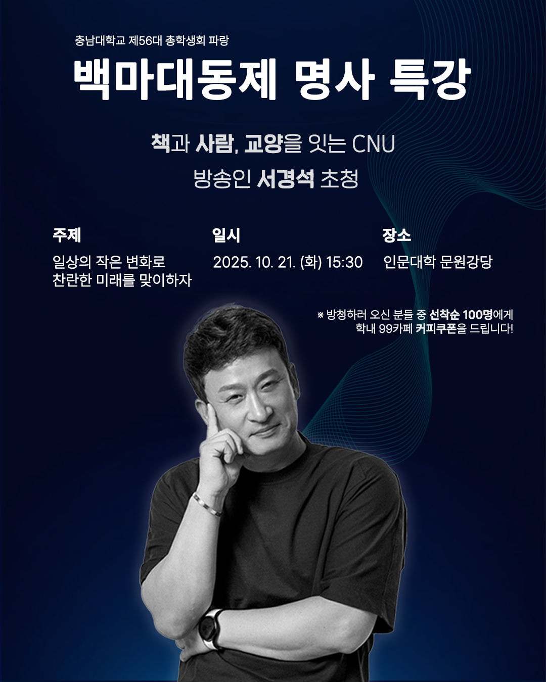 환상으로 물드는 열여덟 번째 물결 학우 여러분, 안녕하십니까. 충남대학교 제56대 파랑 총학생회입니다.<2025 백마대동제 ACCESSIO:환상> 대동제 명사 특강 안내드립니다. 학우 여러분의 많은 관심과 참여 부탁드립니다. 명사 - 방송인 서경석 주제 - 일상의 작은 변화로 찬란한 미래를 맞이하자 일시 - 2025년 10월 21일(화) 15:30 장소 - 인문대학 문원강당 자세한 내용은 카드뉴스를 참고하여 주시기 바라며, 이외 궁금하신 사항은 DM이나 카카오톡 플러스 친구로 문의 바랍니다.