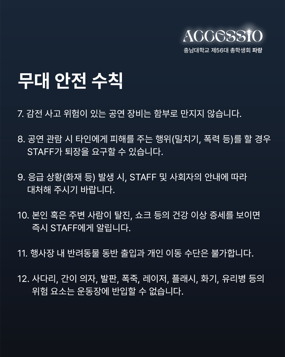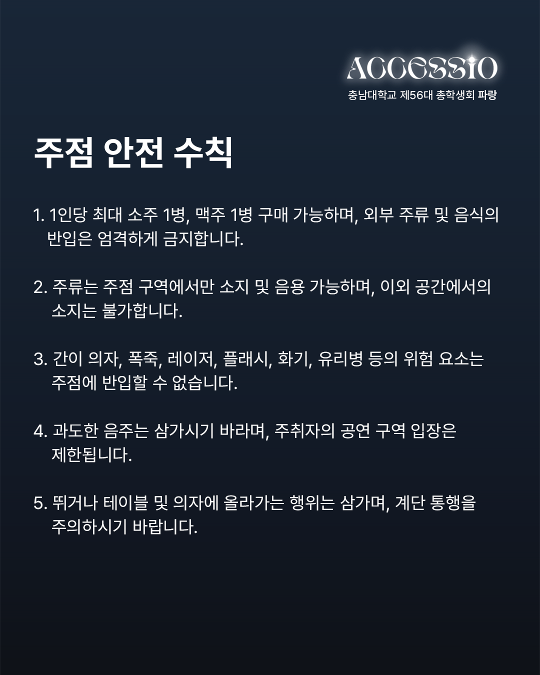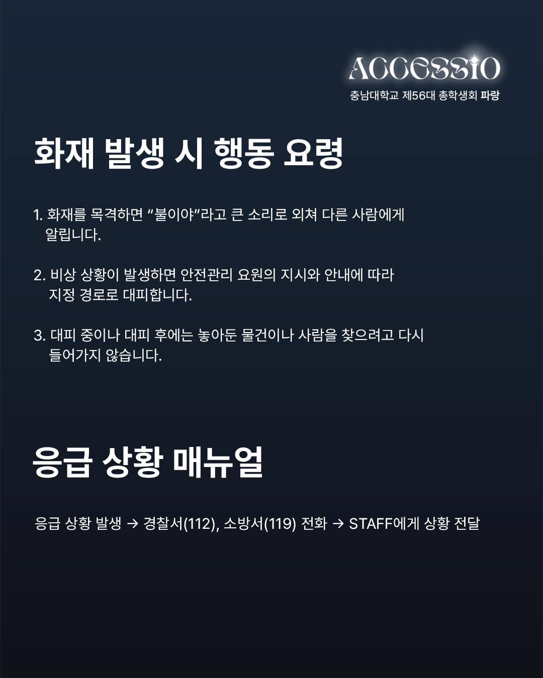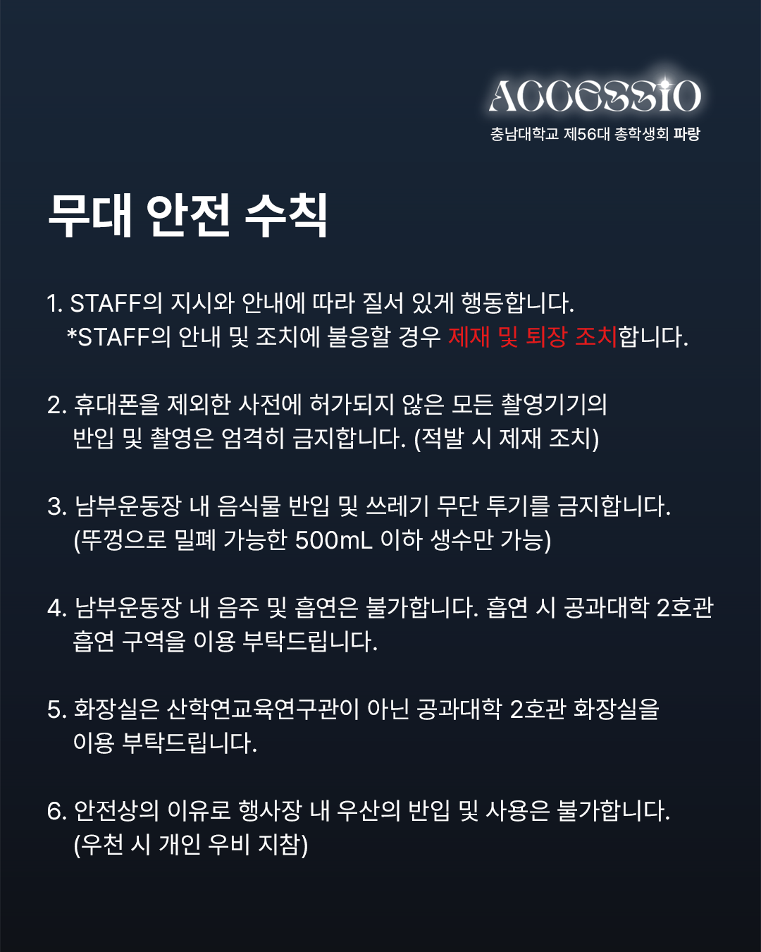 환상으로 물드는 열아홉 번째 물결 충남대학교 제56대 파랑 총학생회입니다. 2025년 충남대학교 <ACCESSIO : 환상> 안전 매뉴얼과 주의사항을 안내드립니다. 함께하는 배려로 더욱 즐거운 축제가 될 수 있도록 안전 매뉴얼과 주의 사항을 숙지하고 준수해 주시기 바랍니다. 무대 안전 수칙 1) STAFF의 지시와 안내에 따라 질서 있게 행동합니다. * STAFF의 안내 및 조치에 불응할 경우 제재 및 퇴장 조치합니다. 2) 휴대폰을 제외한 사전에 허가되지 않은 모든 촬영 기기의 반입 및 촬영은 엄격히 금지합니다. (적발 시 제재 조치) 3) 남부 운동장 내 음식물 반입 및 쓰레기 무단 투기를 금지합니다. (뚜껑으로 밀폐 가능한 500mL 이하 생수만 가능) 4) 공연 관람 시 타인에게 피해를 주는 행위(밀치기, 폭력 등)를 할 경우, STAFF가 퇴장을 요구할 수 있습니다. 5) 사다리, 간이 의자, 발판, 폭죽, 레이저, 플래시, 화기, 유리병 등의 위험 요소는 운동장에 반입할 수 없습니다. 주점 안전 수칙 1) 1인당 최대 소주 1병, 맥주 1병 구매 가능하며, 외부 주류 및 음식의 반입은 엄격하게 금지합니다. 2) 주류는 주점 구역에서만 소지 및 음용 가능하며, 이외 공간에서의 소지는 불가합니다. 3) 과도한 음주는 삼가시기 바라며, 주취자의 공연 구역 입장은 제한됩니다. 4) 뛰거나 테이블 및 의자에 올라가는 행위는 삼가며, 계단 통행을 주의하시기 바랍니다. 5) 주점 내 흡연은 불가합니다. 흡연 시 공과대학 2호관 흡연 구역을 이용 부탁드립니다. 도로 안전 수칙 1) 무단횡단을 금지하고, 횡단보도 이용 부탁드립니다. 2) 뛰거나 통행을 방해하는 행위는 금지합니다. 3) 정해진 출입구를 통해 입·퇴장하고, 통제구역에는 출입하지 않습니다. 4) 원활한 통행과 안전을 위하여 남부 운동장 인근 인도에서의 허가받지 않은 촬영 기기 사용은 금지합니다.(적발 시 제재 조치) 5) 개인 이동 수단은 남부 운동장과 주점에서 떨어진 주차구역에 주차 부탁드립니다. * 안전사고를 대비하기 위하여 파랑 총학생회에서 더 많은 무대, 주점, 도로 안전 수칙과 군중 압착 사고 시 행동요령, 화재 발생 시 행동 요령, 응급상황 매뉴얼을 알려드리니 참고하시고 안전 매뉴얼과 주의 사항을 꼭 지켜주시길 바랍니다. 자세한 내용은 카드뉴스를 참고하여 주시길 바라며, 이외 궁금하신 사항은 DM이나 카카오톡 플러스 친구로 문의 바랍니다. |