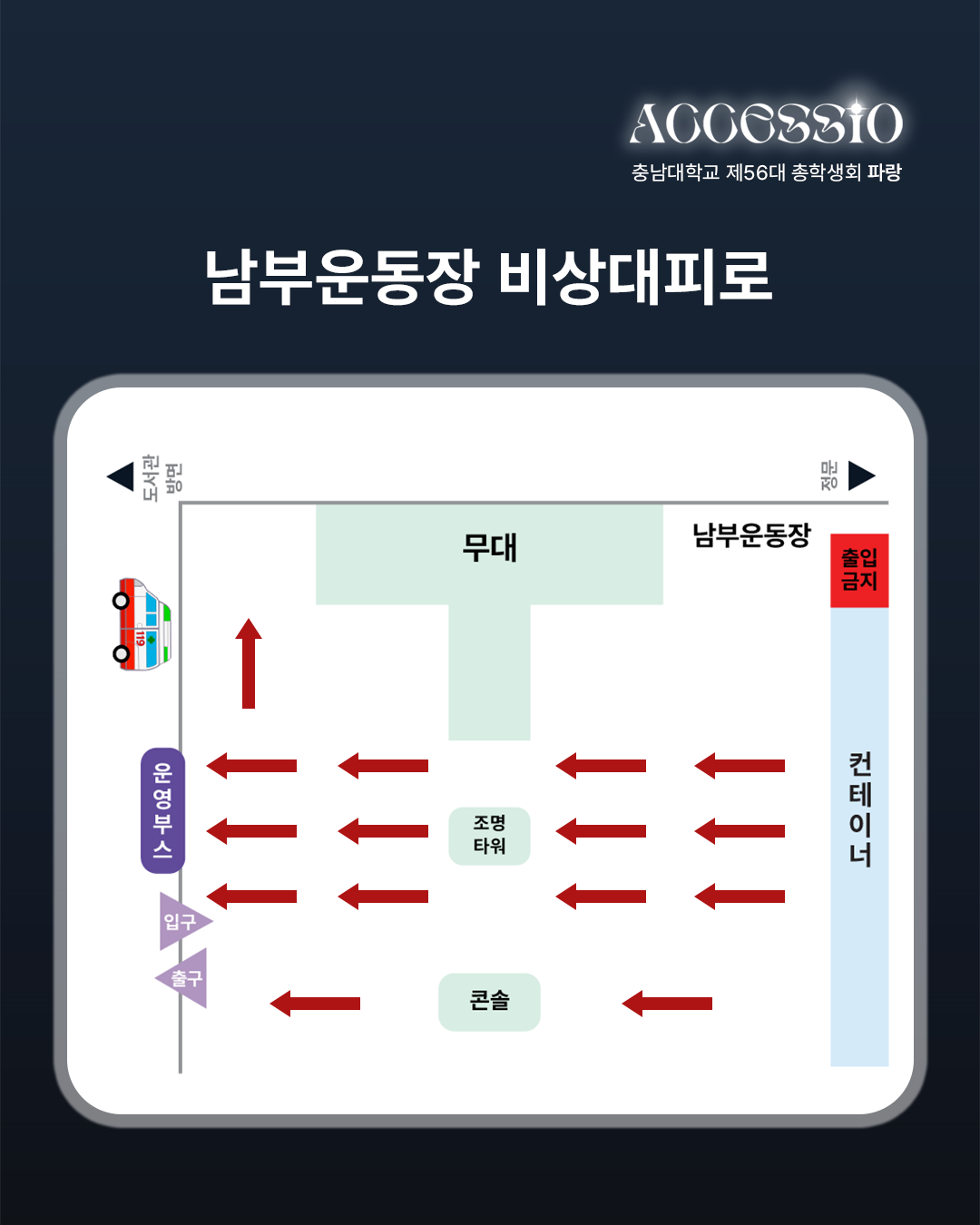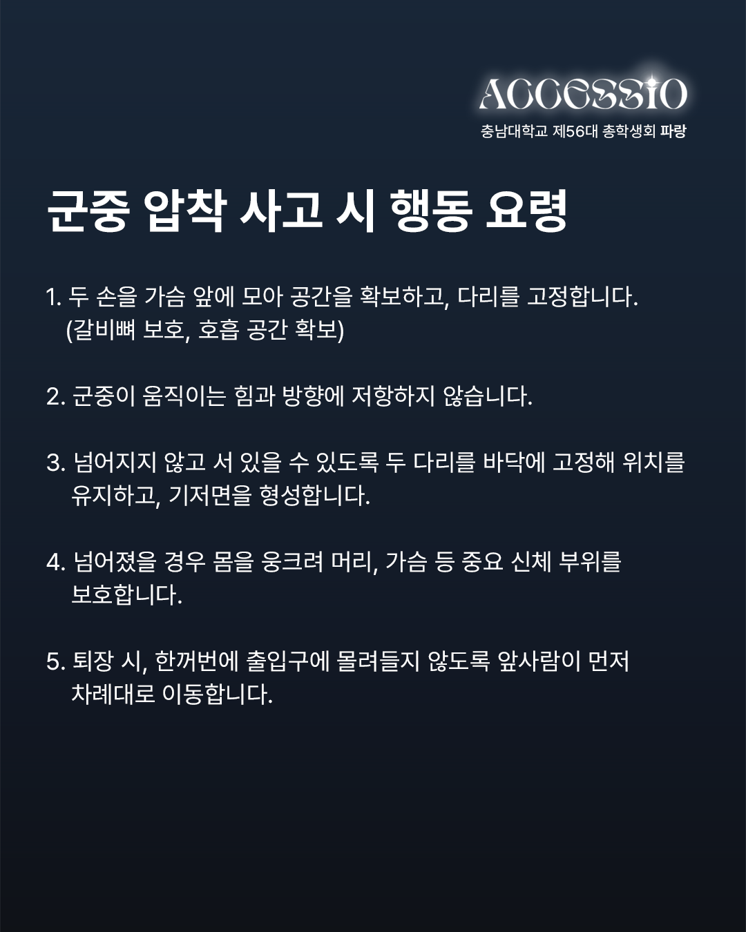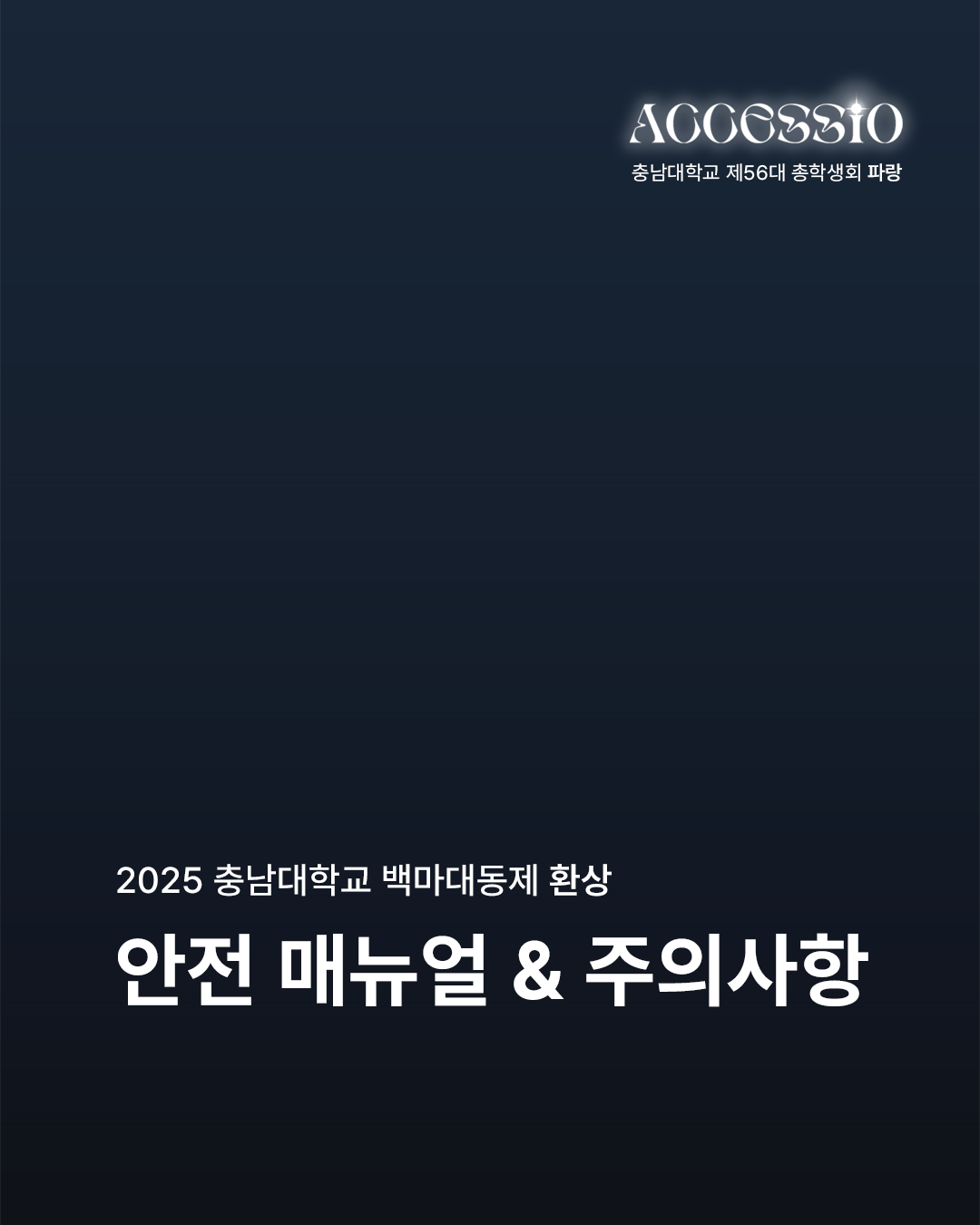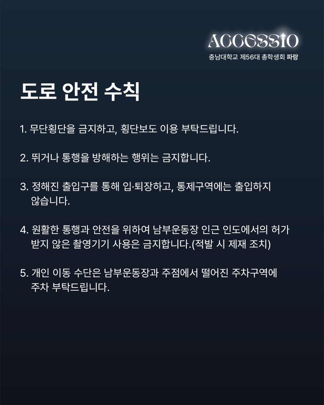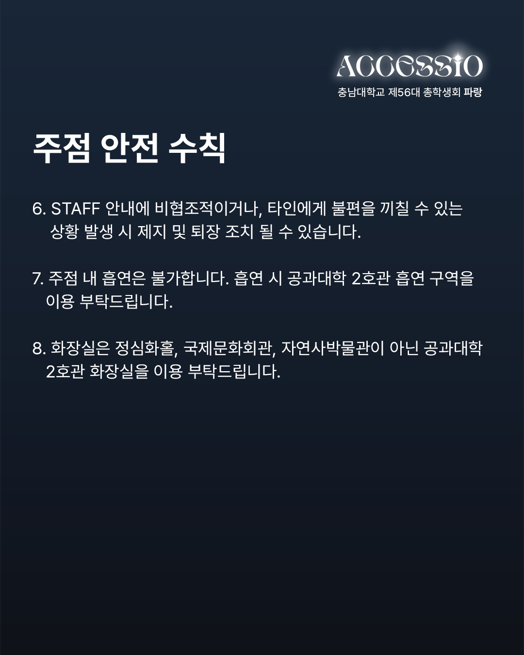환상으로 물드는 열아홉 번째 물결 충남대학교 제56대 파랑 총학생회입니다. 2025년 충남대학교 <ACCESSIO : 환상> 안전 매뉴얼과 주의사항을 안내드립니다. 함께하는 배려로 더욱 즐거운 축제가 될 수 있도록 안전 매뉴얼과 주의 사항을 숙지하고 준수해 주시기 바랍니다. 무대 안전 수칙 1) STAFF의 지시와 안내에 따라 질서 있게 행동합니다. * STAFF의 안내 및 조치에 불응할 경우 제재 및 퇴장 조치합니다. 2) 휴대폰을 제외한 사전에 허가되지 않은 모든 촬영 기기의 반입 및 촬영은 엄격히 금지합니다. (적발 시 제재 조치) 3) 남부 운동장 내 음식물 반입 및 쓰레기 무단 투기를 금지합니다. (뚜껑으로 밀폐 가능한 500mL 이하 생수만 가능) 4) 공연 관람 시 타인에게 피해를 주는 행위(밀치기, 폭력 등)를 할 경우, STAFF가 퇴장을 요구할 수 있습니다. 5) 사다리, 간이 의자, 발판, 폭죽, 레이저, 플래시, 화기, 유리병 등의 위험 요소는 운동장에 반입할 수 없습니다. 주점 안전 수칙 1) 1인당 최대 소주 1병, 맥주 1병 구매 가능하며, 외부 주류 및 음식의 반입은 엄격하게 금지합니다. 2) 주류는 주점 구역에서만 소지 및 음용 가능하며, 이외 공간에서의 소지는 불가합니다. 3) 과도한 음주는 삼가시기 바라며, 주취자의 공연 구역 입장은 제한됩니다. 4) 뛰거나 테이블 및 의자에 올라가는 행위는 삼가며, 계단 통행을 주의하시기 바랍니다. 5) 주점 내 흡연은 불가합니다. 흡연 시 공과대학 2호관 흡연 구역을 이용 부탁드립니다. 도로 안전 수칙 1) 무단횡단을 금지하고, 횡단보도 이용 부탁드립니다. 2) 뛰거나 통행을 방해하는 행위는 금지합니다. 3) 정해진 출입구를 통해 입·퇴장하고, 통제구역에는 출입하지 않습니다. 4) 원활한 통행과 안전을 위하여 남부 운동장 인근 인도에서의 허가받지 않은 촬영 기기 사용은 금지합니다.(적발 시 제재 조치) 5) 개인 이동 수단은 남부 운동장과 주점에서 떨어진 주차구역에 주차 부탁드립니다. * 안전사고를 대비하기 위하여 파랑 총학생회에서 더 많은 무대, 주점, 도로 안전 수칙과 군중 압착 사고 시 행동요령, 화재 발생 시 행동 요령, 응급상황 매뉴얼을 알려드리니 참고하시고 안전 매뉴얼과 주의 사항을 꼭 지켜주시길 바랍니다. 자세한 내용은 카드뉴스를 참고하여 주시길 바라며, 이외 궁금하신 사항은 DM이나 카카오톡 플러스 친구로 문의 바랍니다. |